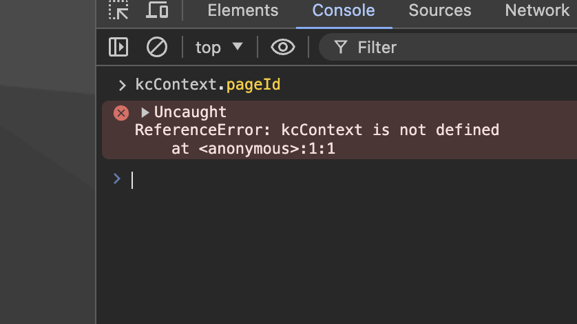 <figure><img src="https://2433528344-files.gitbook.io/~/files/v0/b/gitbook-x-prod.appspot.com/o/spaces%2FzephDFFKQAUfV0vLPNVI%2Fuploads%2Fgit-blob-7b1bfa4e9ff5b96dbeeea67ebc34dbbed908f333%2Fimage%20(21).png?alt=media" alt=""><figcaption><p>No kcContext defined on the global</p></figcaption></figure>