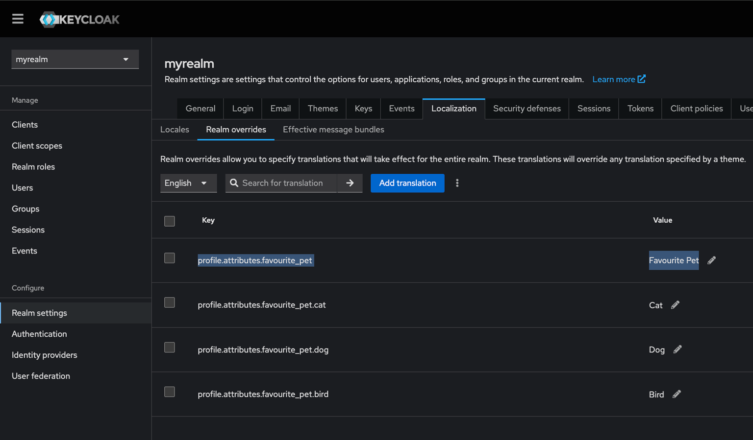 Now this is perfect for defining generale purpose text. But some other translations messages are more specific to a specific Keycloak configuration and are best configured via the Keycloak Account Console.\