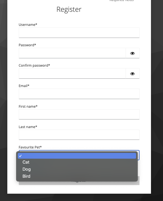 <figure><img src="https://2643300760-files.gitbook.io/~/files/v0/b/gitbook-x-prod.appspot.com/o/spaces%2F4Ls5iTdfTS2xECgBfw90%2Fuploads%2Fgit-blob-c81713daedf76a2f548276ce6034634074c6565d%2Fimage%20(11).png?alt=media" alt="" width="312"><figcaption><p>"Favourite Pet" is correctly used as Display Name for the input field in the register page</p></figcaption></figure>