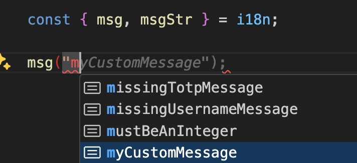 <figure><img src="https://2643300760-files.gitbook.io/~/files/v0/b/gitbook-x-prod.appspot.com/o/spaces%2F4Ls5iTdfTS2xECgBfw90%2Fuploads%2Fgit-blob-e68775bb5a8c9646a3af6f51a00cd27c54305547%2Fimage%20(8).png?alt=media" alt="" width="356"><figcaption><p>TypeScript knows that "myCustomMessage" is a valid key</p></figcaption></figure>